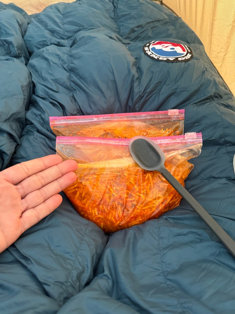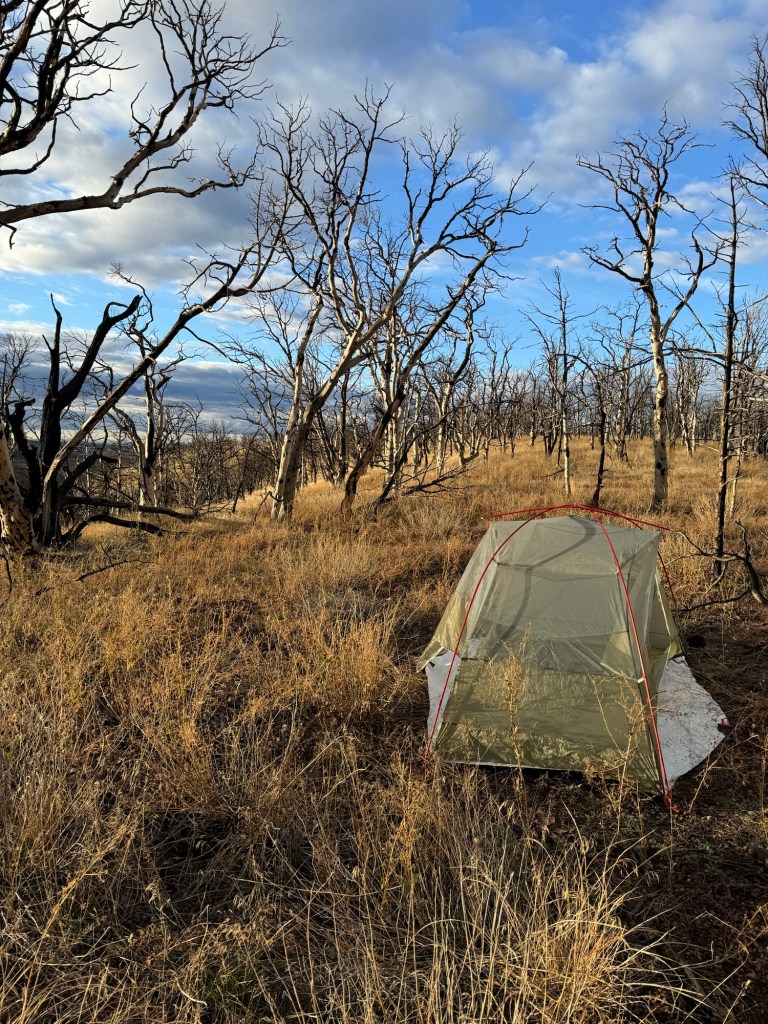 The hike was pretty smooth for the most part with not much elevation change. We had pretty views, and lots more cows! We decided to set up camp when we saw the clouds rolling in and we were about .5 miles from the next water source. We had plenty of water to make dinner and hydrate before calling it a night. Family Mule can have the tent set up in under 3 minutes or so it seemed (I need to time him)! We had freeze dried spaghetti for dinner, YUM! We made it in the tent just as the rain started. The wind and rain were beating on the tent all night but our Big Agnus tent held up well!