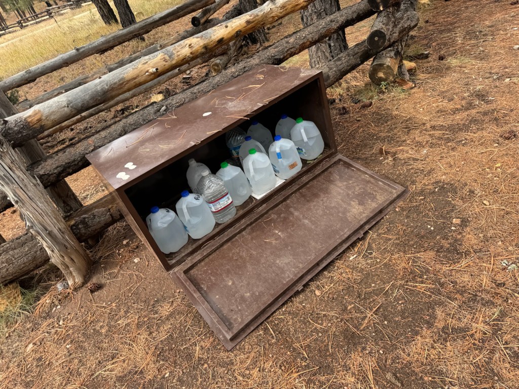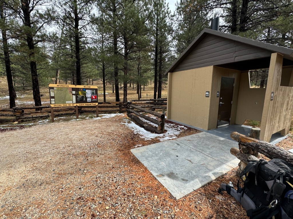 Once we reached another .8 miles, we found the trail crossed the highway to a camp area. It had a restroom and a bear box filled with water. We didn’t need it but it will be good for the next people who pass through.