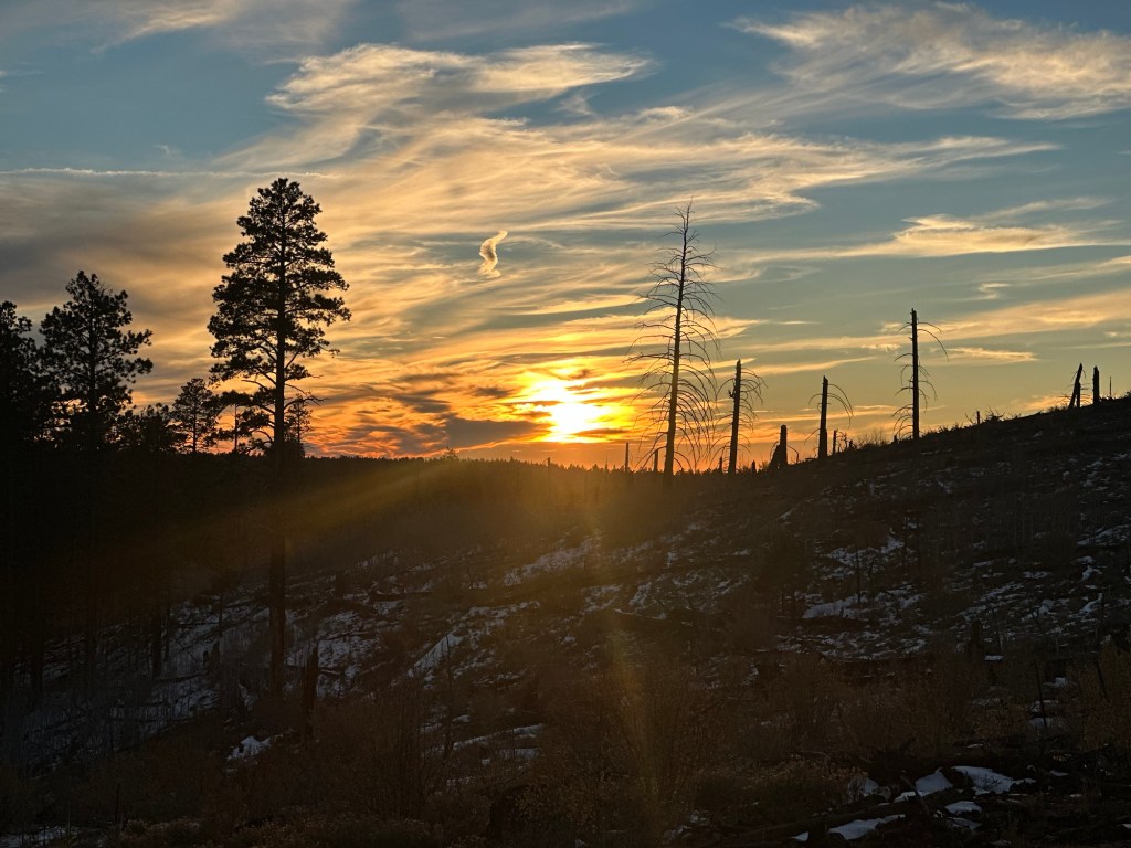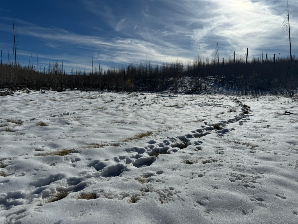 The terrain was harder today especially with the snow. We were through 8 miles of burnt forest that looked like awake zone covered in snow. We both ended up having sun burned faces as the sun beat down and the snow was reflecting back on us.