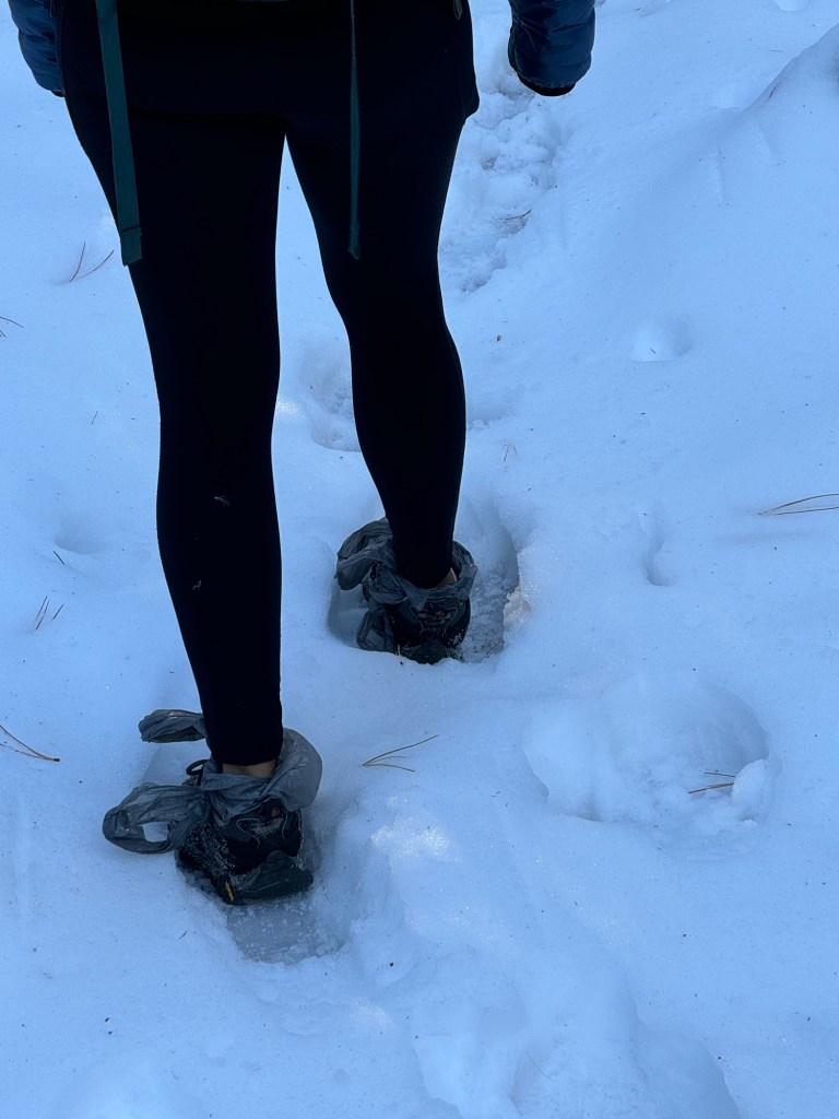 As we kept on the trail the snow was deeper and deeper. We came to a large opening where all we could see was snow and some views of the green pines once in a while. The snow was so deep it was hard to walk through. Each step I took I had no idea if I would stay on top, crash through a couple inches or crash through a foot. I tried to tie bags on my feet before we started to try to minimize the water getting to my feet. It didn’t work! I was still soaked and so was Family Mule. The morning was very cold so the tops of my soaked shoes had frost and snow covering them. The bottom of my pants were even frozen.