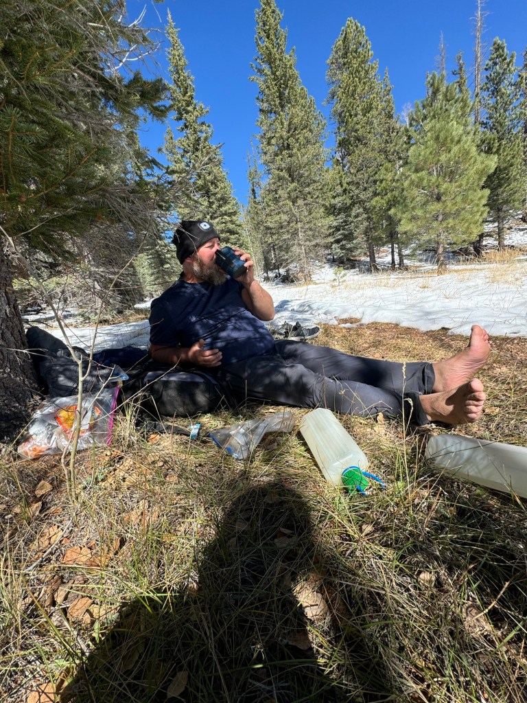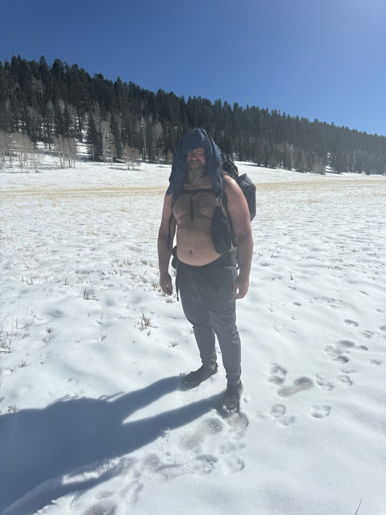 After lunch we pressed forward (not very willingly). We were in another snow field. This time the sun was beating down on our heads at full force and reflecting on the snow. Snow blindness is real! I know what you are thinking:…why didn’t you bring sunglasses! Well we did! Somehow we lost them in the snow yesterday! We believe they are on the log we took a break on but not worth going back for. We pushed 4.75 miles through the deep snow under our feet and the sun beating down on our heads. We both had burns on our faces and Family Mules head. We took our shirts off and put them on our heads which made a little visor type thing. It was comical if you were to see us but it worked to get us across the area.
